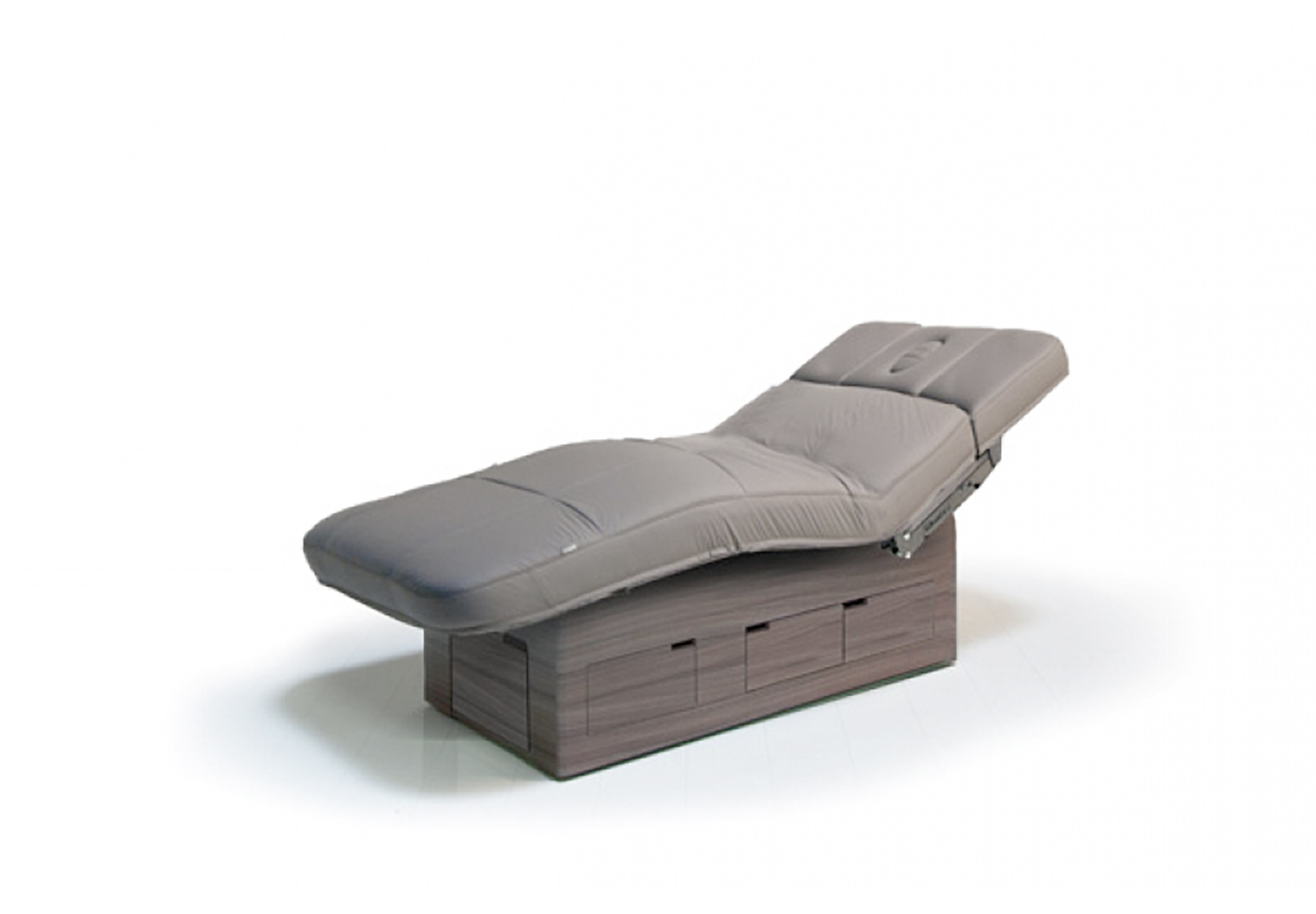 Luxurious spa table with very low access of 50cm making it suitable for clients with physical disabilities. Up to six motors to set height, back, leg and foot sections, also optionally available for armrests. Up to eight memory functions. Especially hard wearing, with stitched PU soft upholstery and flexible storage space. * Image shown in 850mm with Choco upholstery, wenge base and dark brown metal parts and base with storage option.