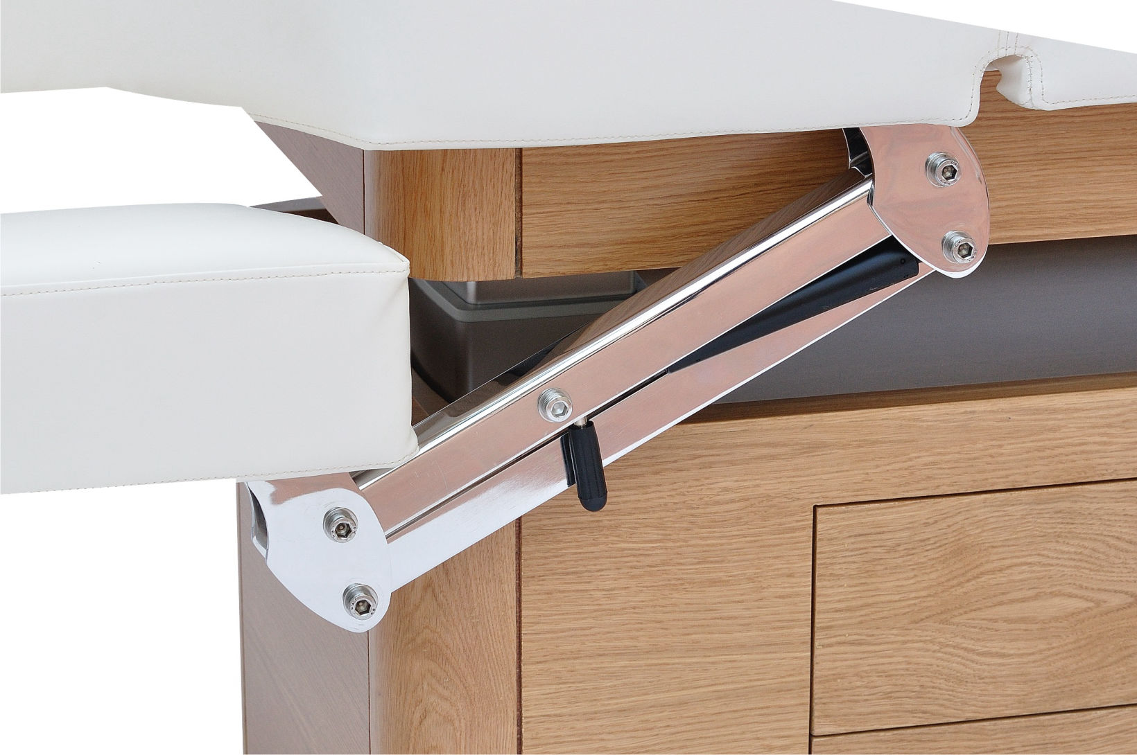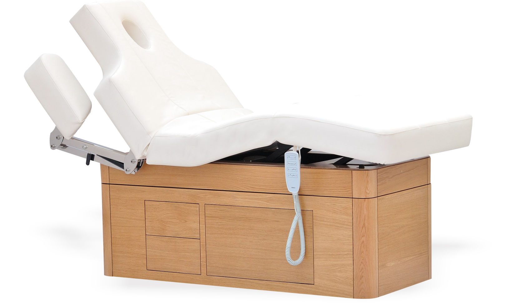 Mudra Electric Spa Table is a professional high-end electric spa table. Electronic adjustments, lowerable armrests and plenty of storage drawers and space to store a hot towel cabinet inside the bed.